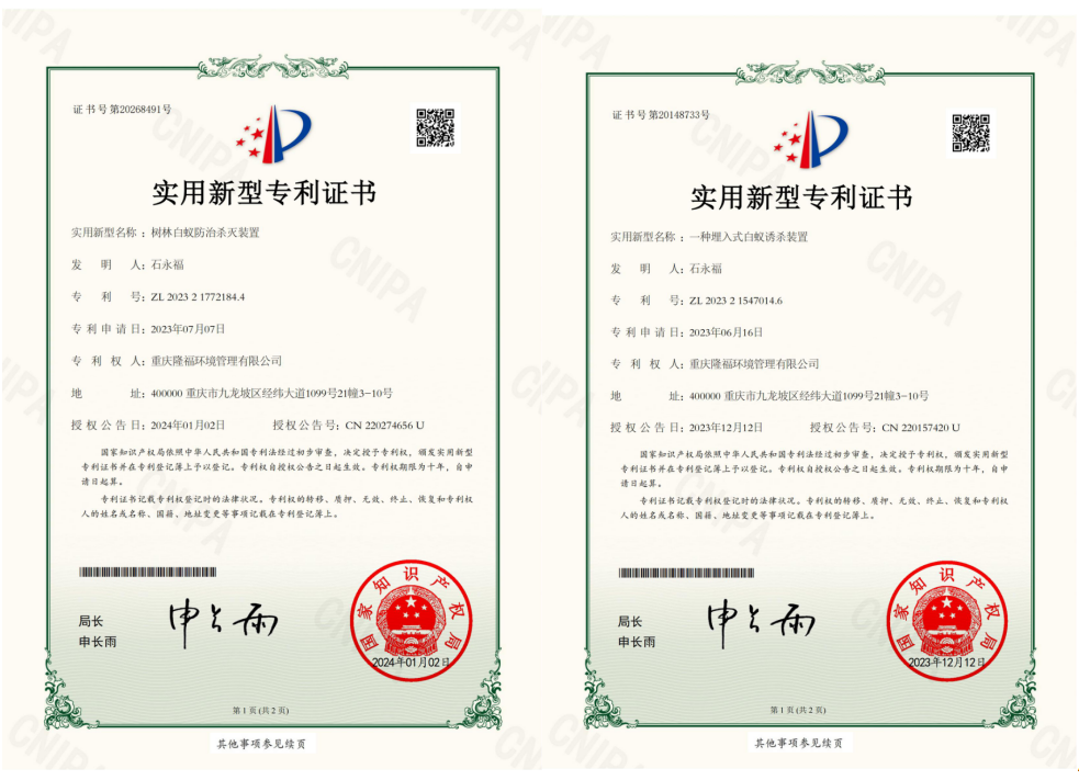 白蟻監測控制裝置防治白蟻的原理是將白蟻喜食且對白蟻具有極強引誘力的木塊固定在監測控制裝置內,然后將監測控制裝置按一定的要求安裝在需保護的房屋、樹木周圍或堤壩內、外坡及坡頂土壤中,外出覓食的工蟻到達監測控制裝置周圍一定距離處的土壤中后,由于受裝置內木塊釋放在土壤中的引誘物質的強烈吸引,迅速將蟻路修筑至監測控制裝置,并紛紛進入裝置內取食。